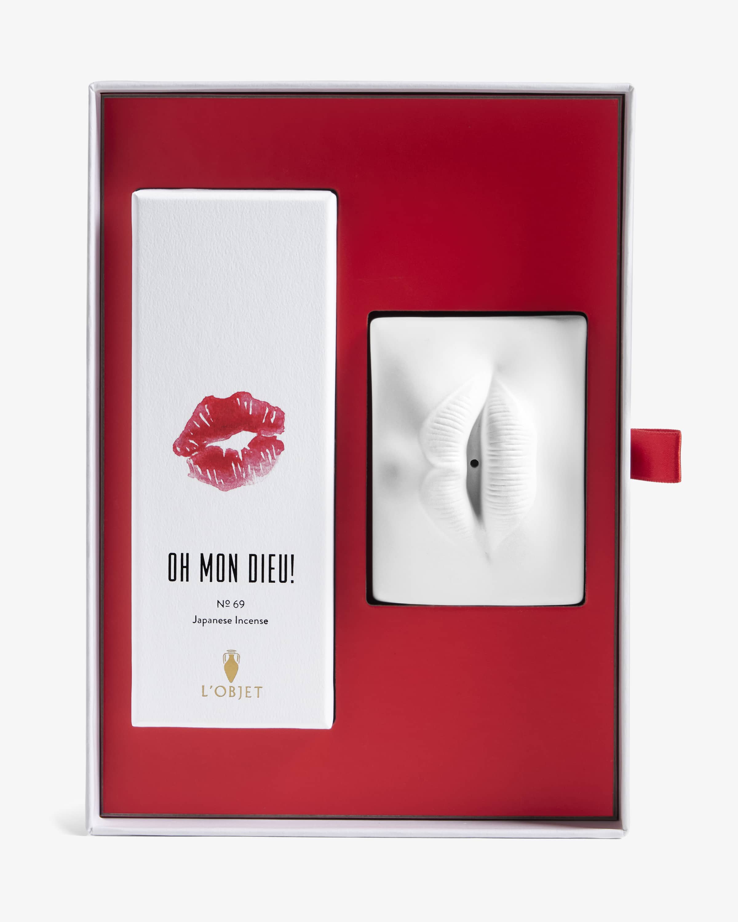 Räucherstäbchen-Set Smoking Lip von L'Objet. Das führende Luxushaus für Düfte und Design ist das Lebenswerk des Gründers Elad Yifrach. Durch seine globale Designperspektive wird jedem Produkt seine eigene Geschichte verliehen. Dieses Set kombiniert hochwertigen japanischen Weihrauch mit dem ikonischen Porzellan- Weihrauchhalter in Lippenform und schafft so ein umfassendes Sinnesritual. Der Duft vereint Noten von Cognac, Lippenstift und Karamell mit einem Hauch von Weihrauch und Leder und ist von den wilden Nächten des Paris von 1969 inspiriert.