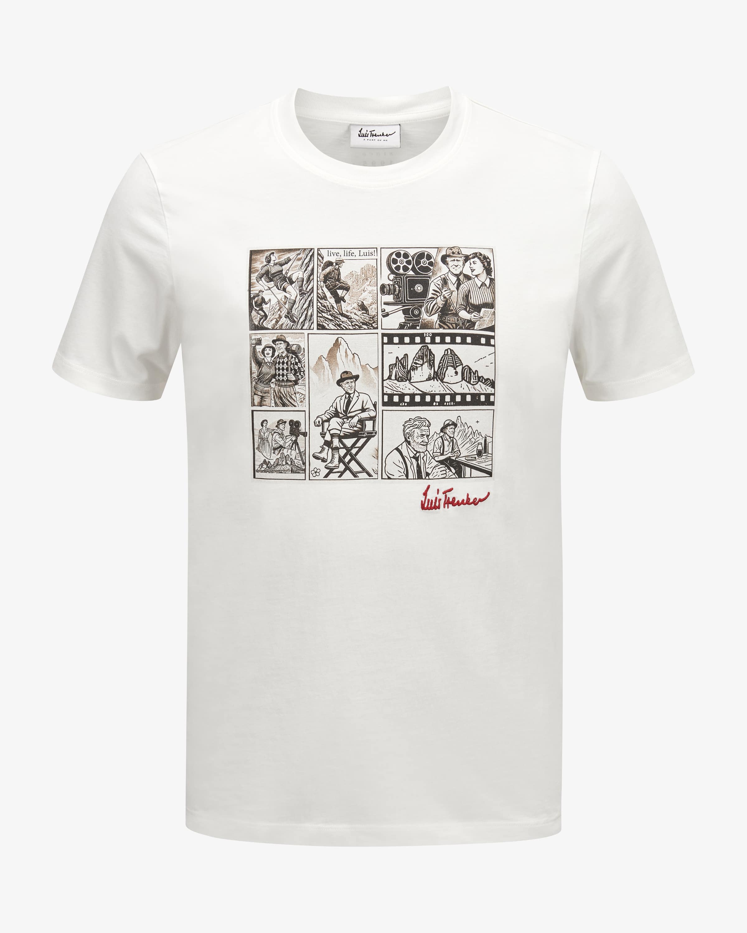 T-Shirt Lucomic für Herren von Luis Trenker in Weiß und Schwarz. Das Modell der traditionsreichen Trachten-Marke überzeugt dank der klassischen Aufmachung in angenehmer Baumwoll-Qualität in legerer Aufmachung, während der Print mit Bergfilm-Kulisse das Gesamtbild mit labeltypischem Charme vollendet.